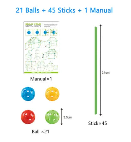 Ce jouet est conçu pour stimuler l'imagination. Pour les tentes plus grandes, privilégiez la construction de triangles avec des bâtons pour une stabilité maximale. Et n'oubliez pas : avec notre kit de construction de fort, la seule limite est leur imagination !
